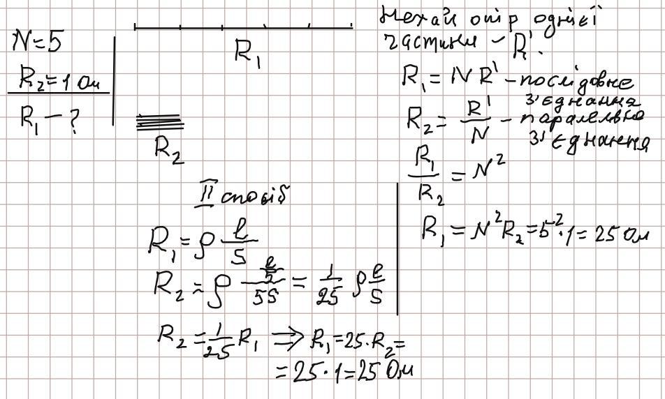 Дріт, шо має по всій довжин однакову плоиу поперечного нерерізу, розрі зали на 5 рів- них частин, які зв'язали потім у щльний пучок. Ошр пучка виявилося рівним 1 Ом. Яке був onip дроту до розрізування"