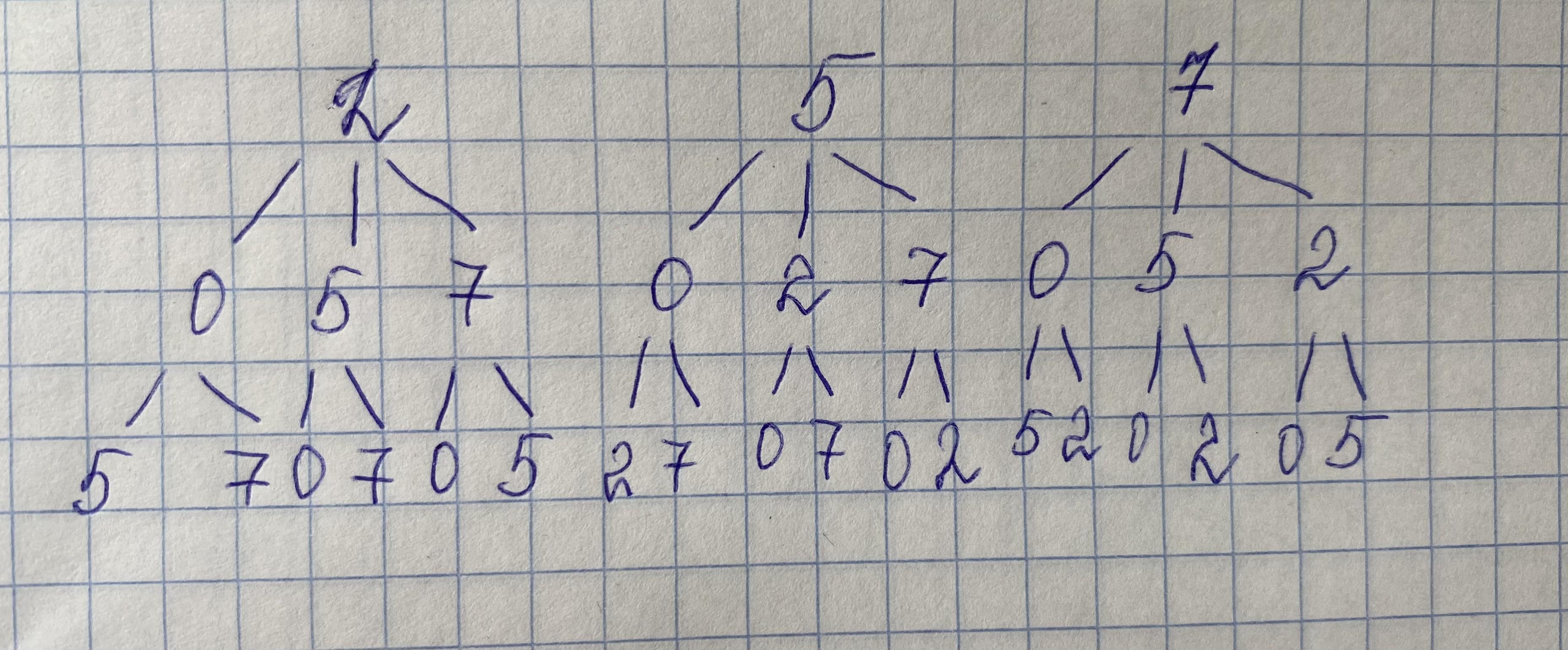3 Сколько трехзначных чисел можно составить из цифр «0», «2», «5», «7», используя в записи числа каждую цифру не более одного раза? Постройте дерево всевозможных вариантов.