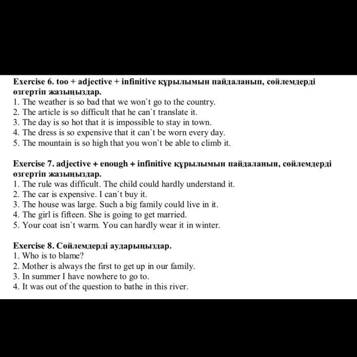 Exercise 8. Сөйлемдерді аударыңыздар.