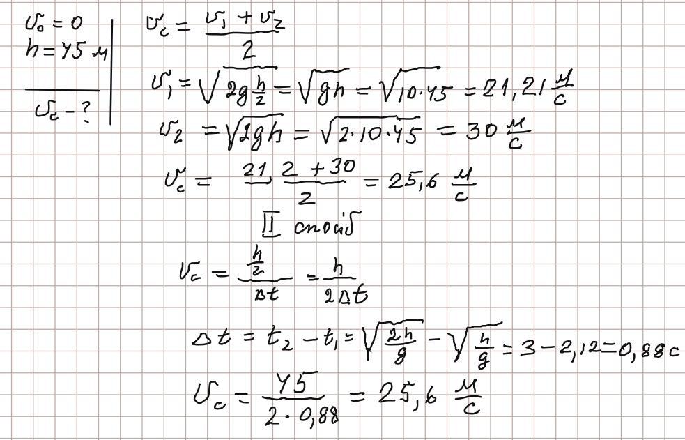 Тiло падає без початкової швидкості з висоти 45 м. Знайти середню швидкость на другій половині шляху. (25,6 м/с)