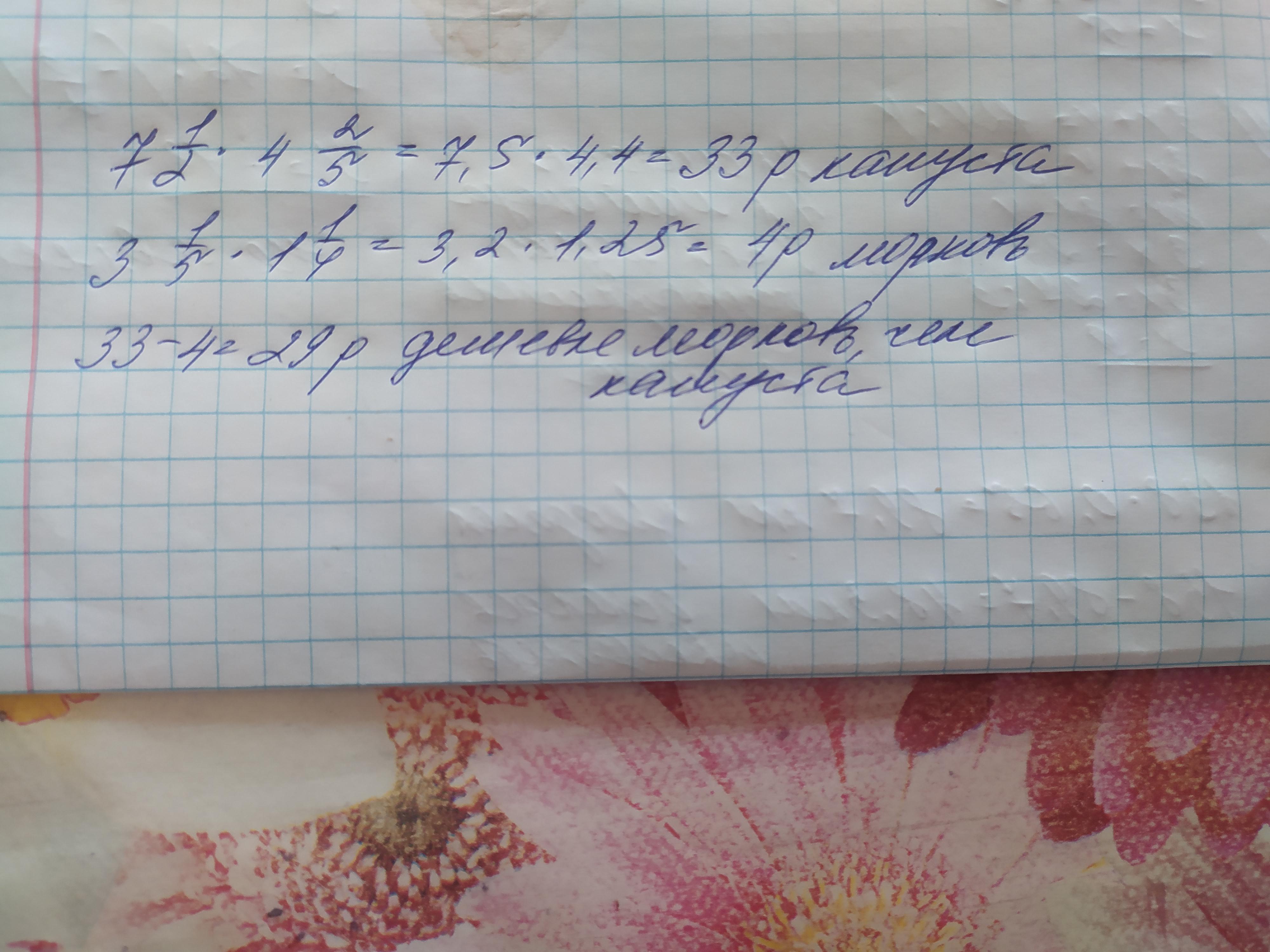Мистер Фокс купил 7 1/2 кг капусты по цене 4 2/5 рубля за килограмм и 3 1/5кг моркови по