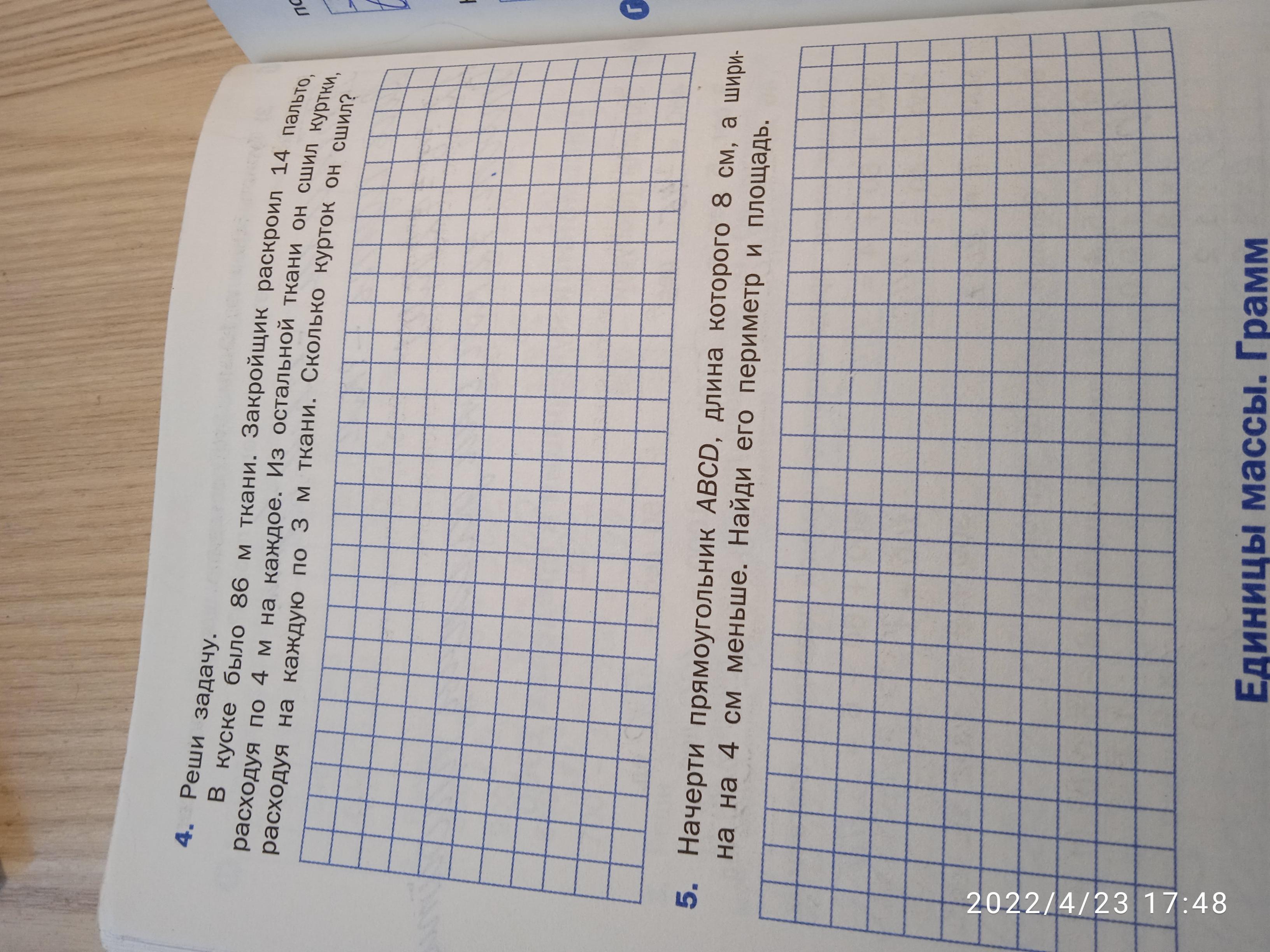 Помогите пж в куске было 86 м ткани закройщик раскрыл 14 пальто расходуя по 4 м на каждую из остальной ткани он шёл куртки расходуя на каждую по 3 м ткани Сколько курток он вышел вторая задача начерти прямоугольник ABCD длина которого 8 см а ширина на 4 см меньше найди его периметр и площадь