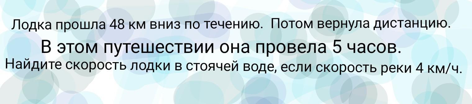 x1=(96+104)/10=20 км/ч скорость лодки в стоячей воде