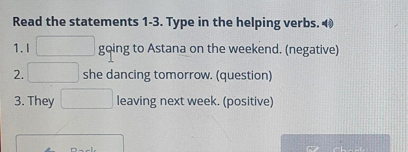 Read the statements 1-3. Type in the helping verbs. 1) Lesson review 1.1 going to Astana on the weekend. (negative) she dancing tomorrow. (question) fit as a fiddle! 2. 3. They Eroduction leaving next week. (positive) помогите плиз)