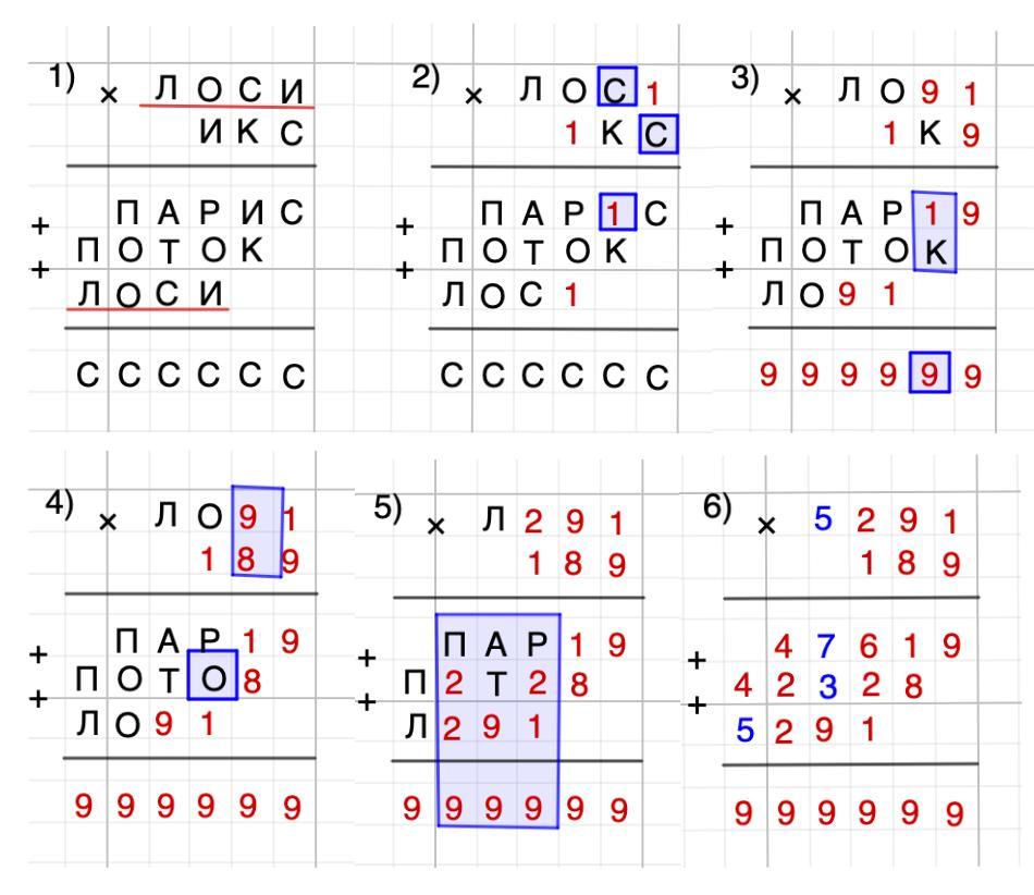 Определимся с цифрой С. Обратим внимание на последнюю. В ней 6 цифр, первая из которых равна сумме разных цифр П+Л. Значит