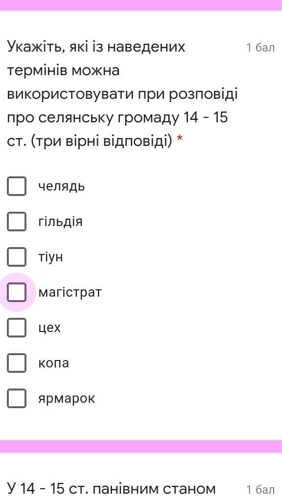 1 бал Укажіть, які із наведених термінів можна використовувати при розповіді про селянську громаду 14 - 15 ст. (три вірні відповіді) * челядь гільдія тоун магістрат цех копа ярмарок