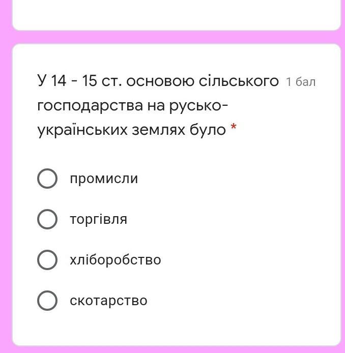 У 14 - 15 ст. основою сільського 1 бал господарства на русько- українських землях було * Опромисли О торгівля Охліборобство Оскотарство