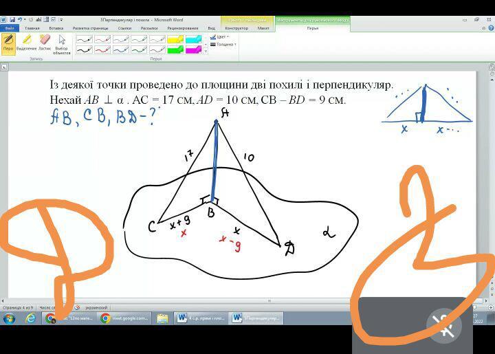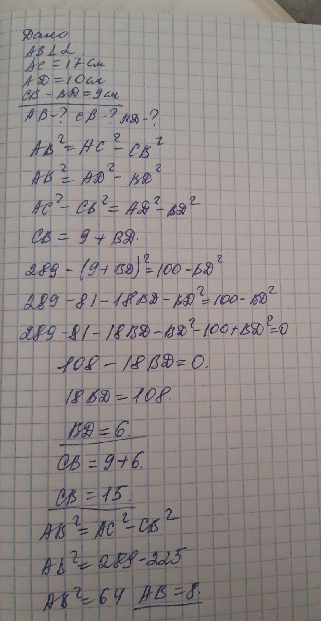 Нехай AB Ia. AC = 17 см, AD = 10 СМ, СВ – BD = 9 СМ.