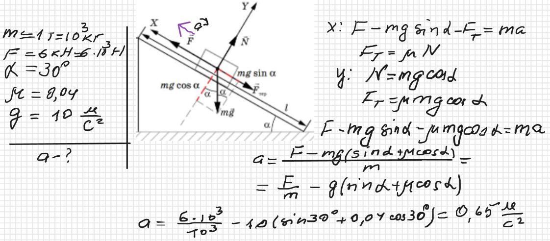 Автомобіль масою 1 т рухається під гору, розвиваючи силу тяги 6 кН. Визначте, з яким прискоренням рухається автомобіль, якщо коефіцієнт опору рухові дорівнює 0,04 , а нахил становить 30'. *