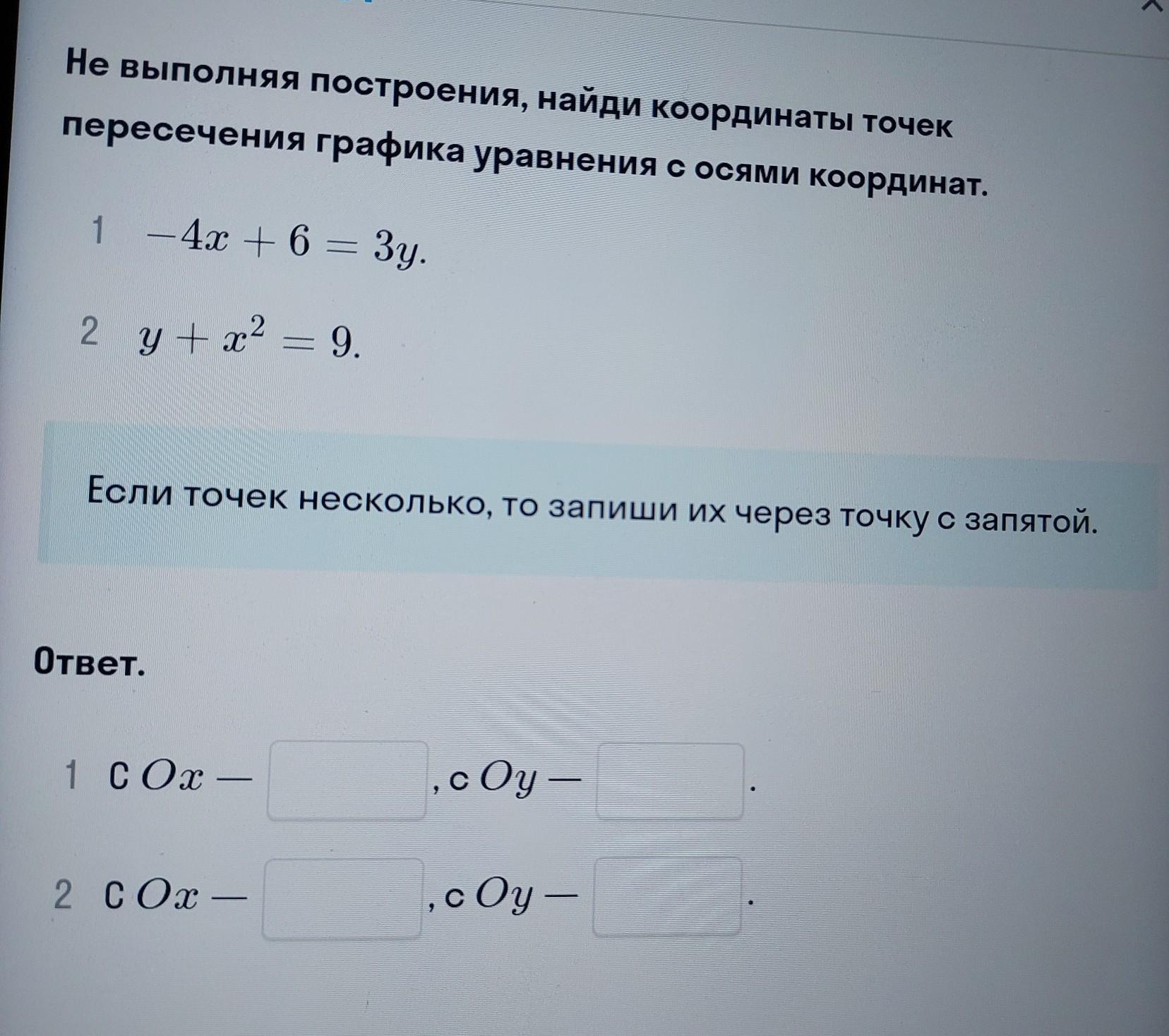 не выполняя построения, найди координаты точек пересечения графика уравнения с осеями координат