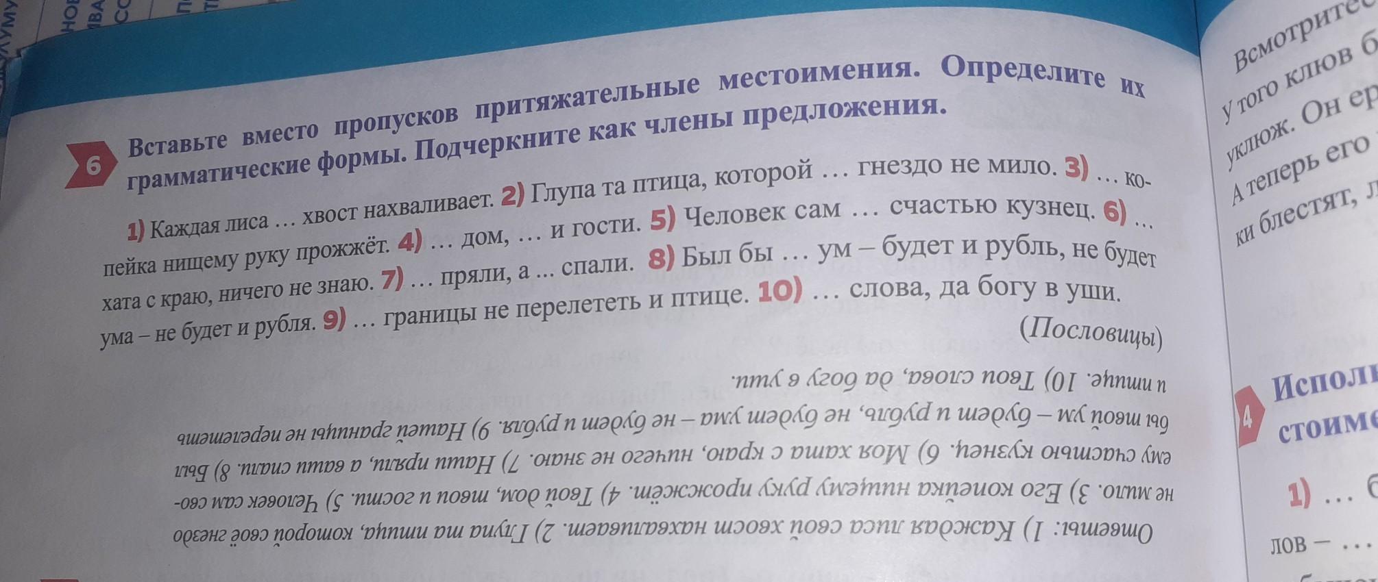 1) Каждая лиса свой хвост нахваливает. 2) Глупа та птица, которой своё гнездо не мило. 3) Его копейка нищему руку прожжёт. 4) Твой дом, твои и гости. 5) Человек сам своему счастью кузнец. 6) Моя хата с краю, нечего не знаю. 7) Наше пряли, а ваши стали. 8) Был бы твой ум - будет и рубль, не будет ума - не будет и рубля. 9) Нашей границы не перелететь и птице. 10) Твои слова, да богу в уши.