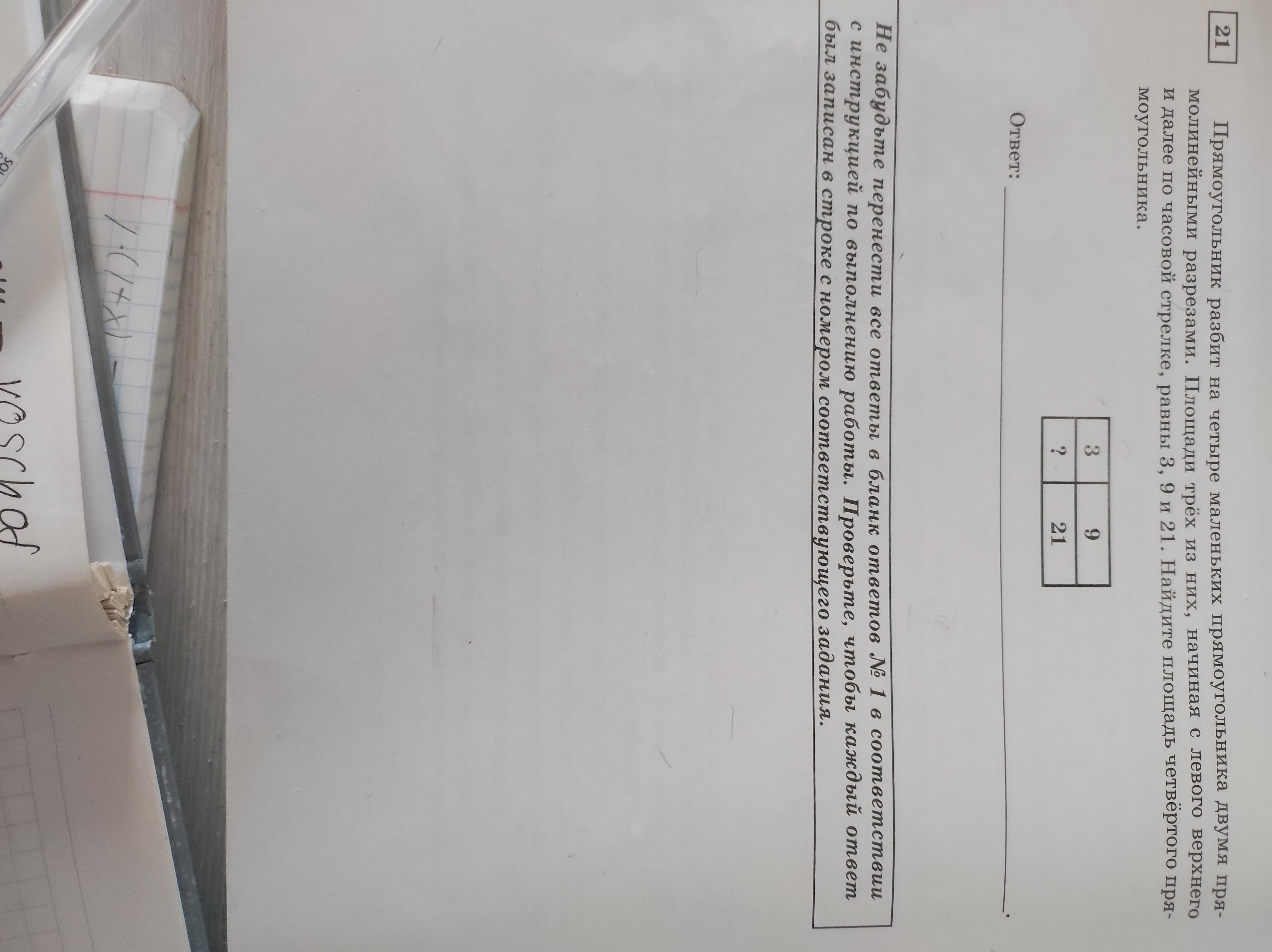 Прямоугольник разбит на четыре маленьких прямоугольника двумя прямолинейными разрезами. Площади трëх из них, начиная с левого верхнего и далее по часовой стрелке, равны 3 9 и 21. Найдите площадь четвëртого прямоугольника. Пожалуйста.