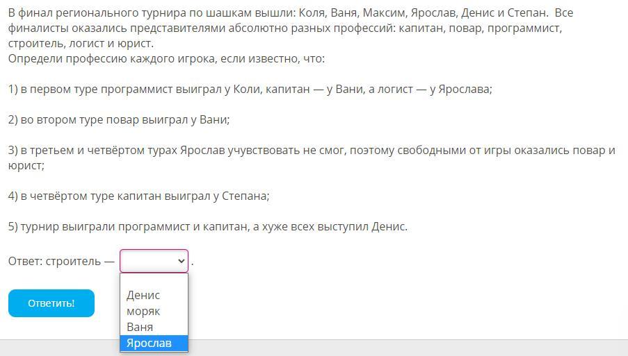 Если есть вариант ответа Коля, то он правильный, если нет, то Ваня. Вот таблица по результатам, единственное спорное осталось кто из них, Коля или Ваня. Если смотреть что Ваня второй раз проиграл, а выбыли Ярослав который юрист или повар и ещё 1 человек, а мы знаем что Ваня не может быть поваром значит он юрист из них обоих. Следовательно в самом конце Коля строитель. Но если там нет варианта Коля то правильный Ваня как я и сказал так как этот вариант с выбыванием его из турнира может быть не верным
