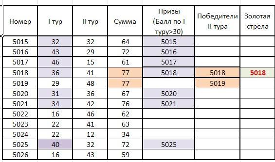 Но 5018 получил приз и по итогам I тура, то, значит, он и получит главный приз - золотую стрелу с серебряным наконечником!