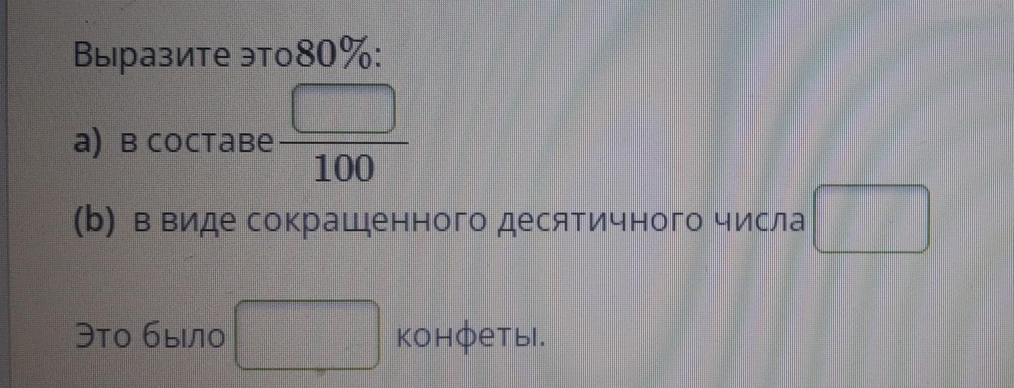 Рита и Олег играли в игру в которой они поделили между собой пакет с конфетами. Рита выиграла 80% от всех конфет А Олег получил 36 конфет Посчитай сколько всего в пакете было конфет?
