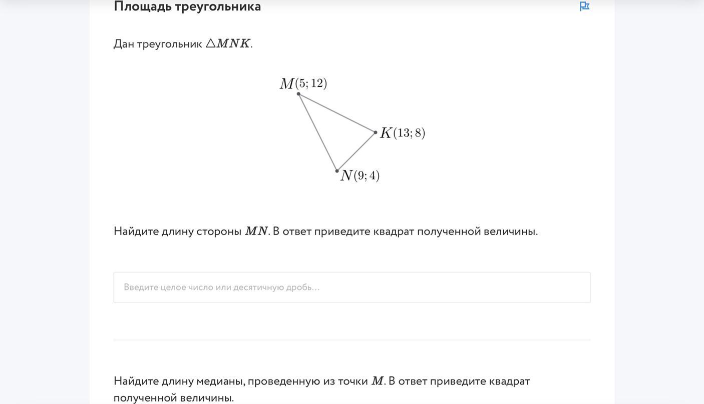 2.Найдите длины медианы, приведённую из точки M.в ответ приведите квадрат полученной величины.