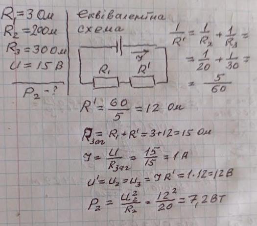 ПОЖАЛУЙСТА ПОМОГИТЕ!! Яка потужність струму в резисторі R2? R1=3 Ом, R2=20 Ом,R3=30 Ом, якщо напруга на джерелі 15 В.