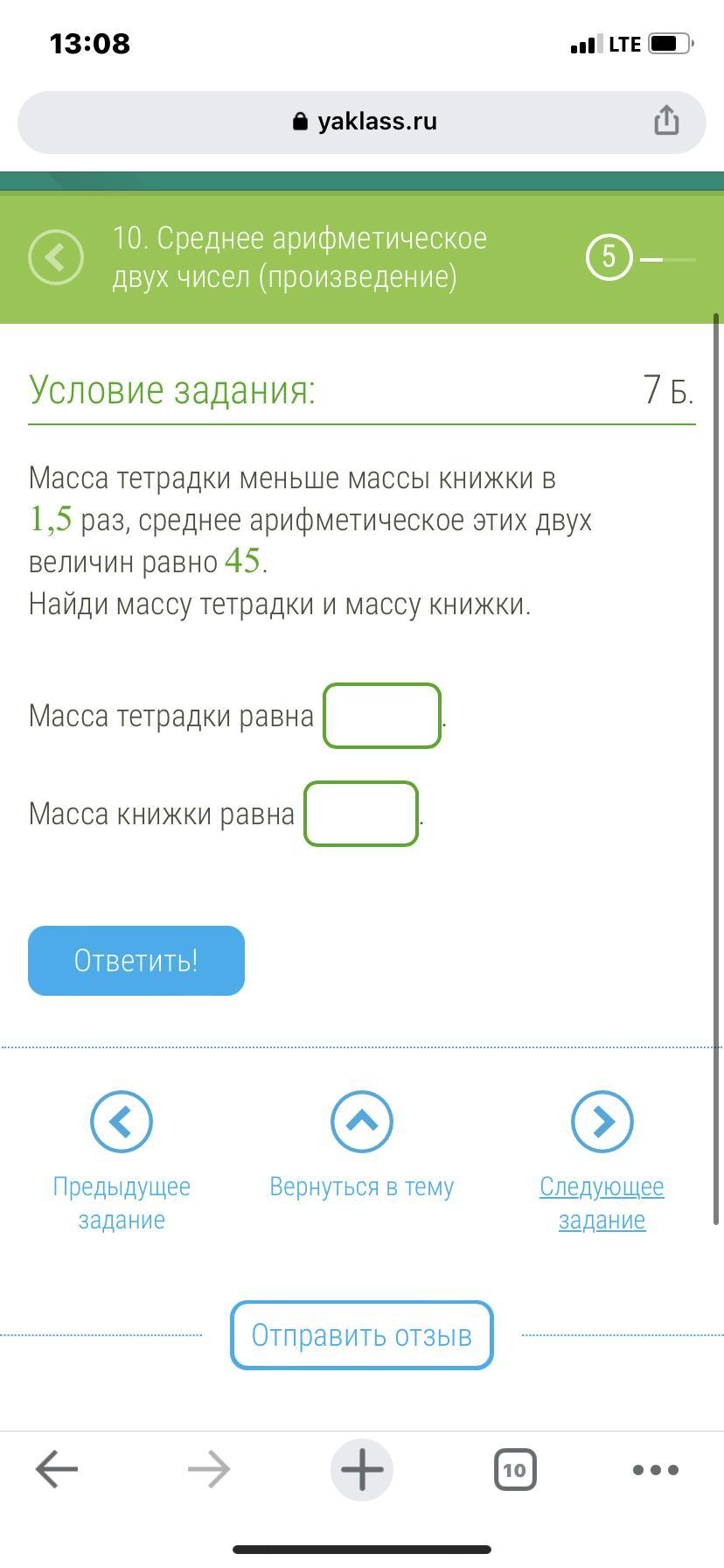 масса тетрадки меньше массы книжки в 1,5 раз, среднее арифметическое этих двух величин равно 45…