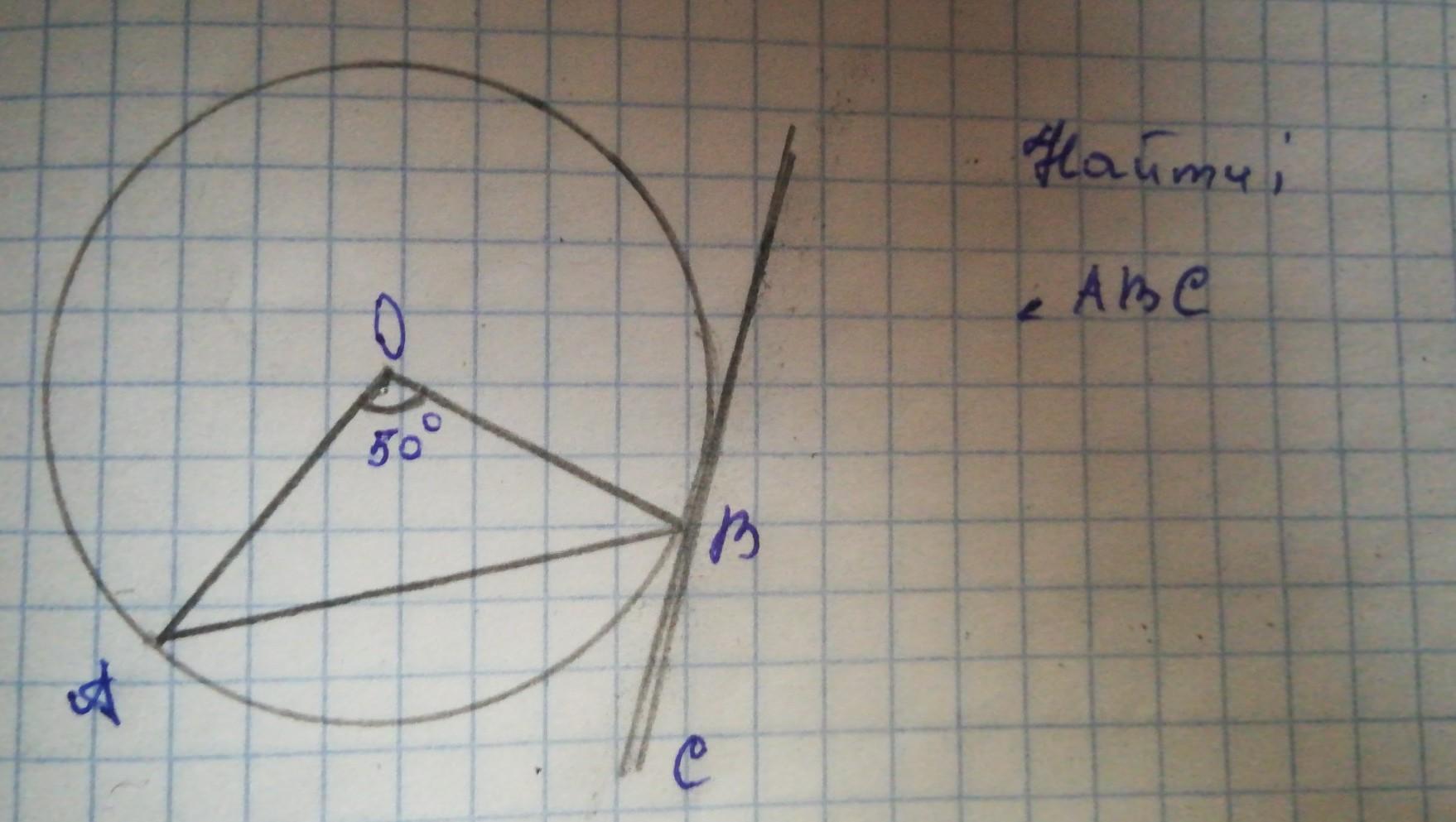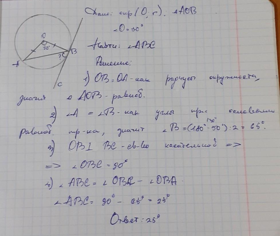 Треугольник ОВА равнобедренный. Значит угол В равен углу А. Тогда 180-50=130, угол В = 130:2=65.