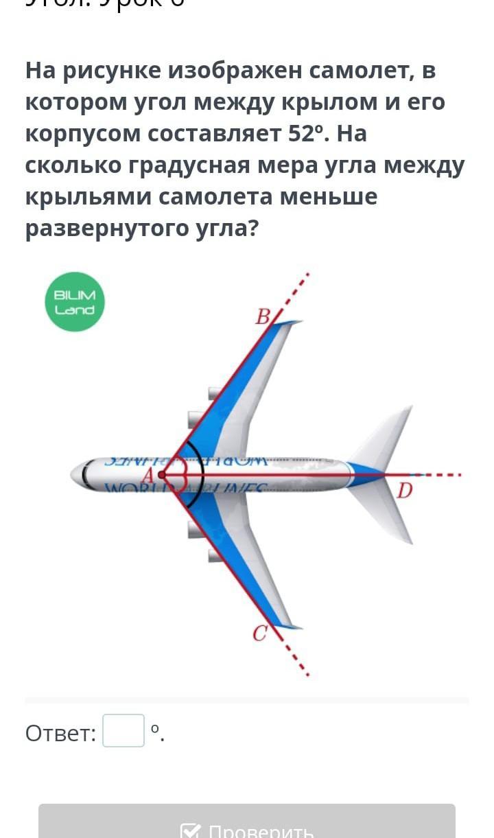 на рисунке изображён самолёт в котором угол между крылом и его корпусом составляет 52° насколько градусная мера угла между крыльями самолёта меньше развернутого угла