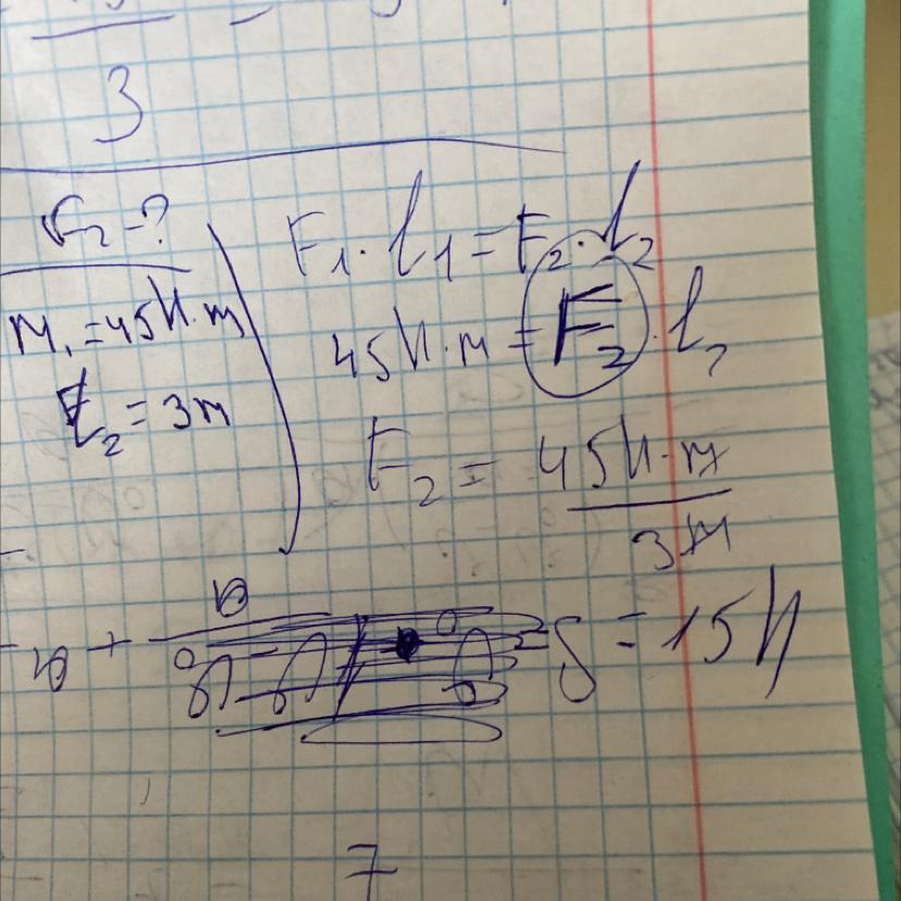 Момент силы F1, действующий на рычаг, равен 45Н. Найди значение второй силы F2, если плечо этой силы равно l2=3. Рычаг находится в равнлвесии.