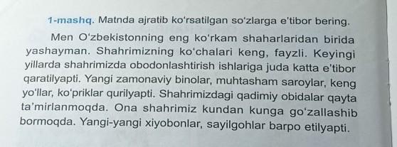2-topshiriq. Savollarga javob bering. 1. Siz qaysi shahar (qishloq, tuman markazi) da yashaysiz? 2. Sizning shahringiz (qishlog'ingiz)da qanday ishlar amalga oshirilmoqda? 3. Siz ona shahringiz (qishlog'ingiz)ning kelajagini qanday tasavvur qilasiz?