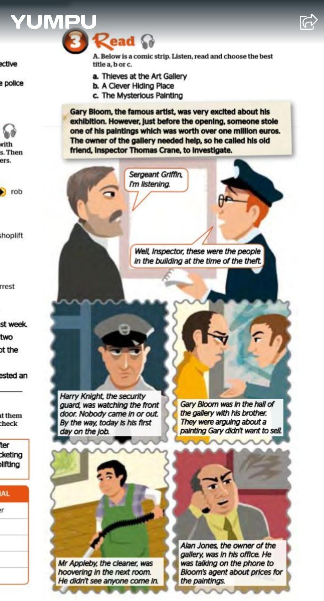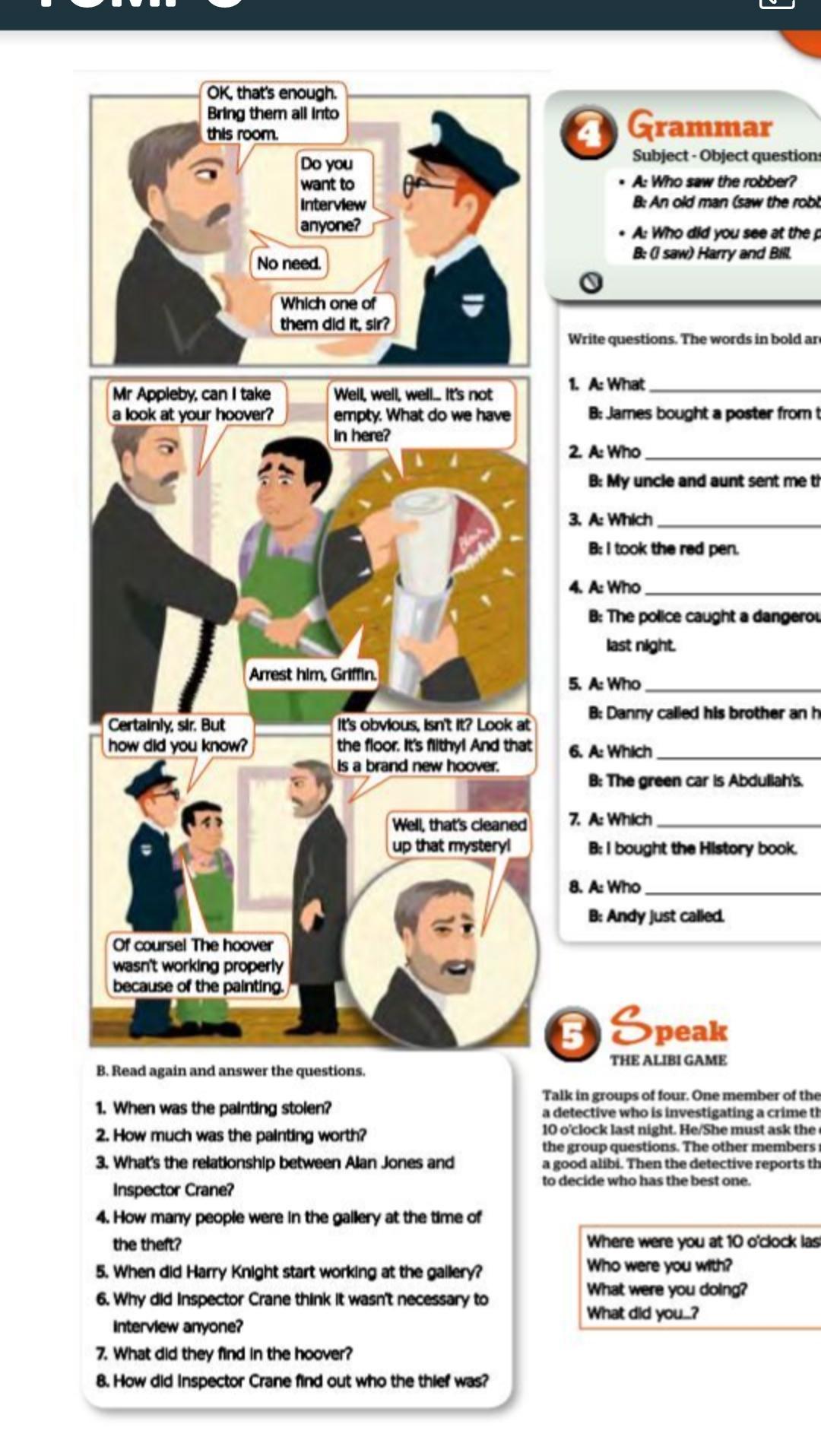When was the painting stolen? 2. How much was the painting worth? 3. What's the relationship between Alan Jones and Inspector Bishop? 4. How many people were in the gallery at the time of the theft? 5. When did Harry Knight start working at the gallery? 6. Why didn't Inspector Bishop want to interview anyone? 7. What did they find in the hoover? 8. How did Inspector Bishop find out who the thief