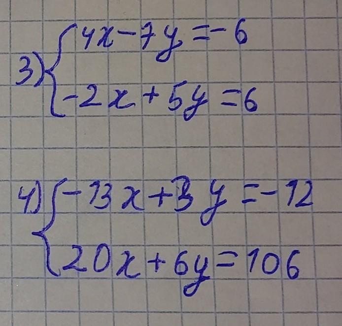 \displaystyle 1)\left \{ {{4x-7y=-6} \atop {-2x+5y=6}} \right. \\\\5(4x-7y)+7(-2x+5y)=5(-6)+7*6\\6x=12\\x=2\\4*2-7y=-6\\y=2\\(x,y)=(2,2)\\\\2)\left \{ {{-13x+3y=-12} \atop {20x+6y=106}} \right.\\ \\2(-13x+3y)-(20x+6y)=2(-12)-106\\-46x=-130\\\\x=\frac{65}{23}\\ \\-13(\frac{65}{23})+3y=-12\\ \\y=\frac{569}{69}\\ \\(x,y)=(\frac{65}{23},\frac{569}{69})