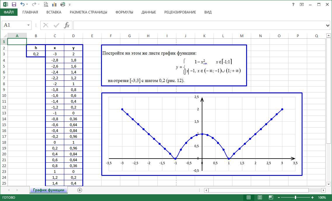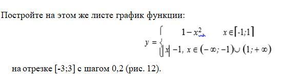 - в ячейку D3 запишем формулу для нахождения последующих значений y: =ЕСЛИ(И(C3>=-1;C3<=1);1-C3^2;ABS(C3)-1) (используем функцию ЕСЛИ для выбора из двух возможных результатов и функцию И для записи составного логического выражения для функции ЕСЛИ)