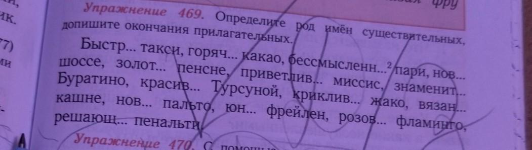 Быстрое такси(ср.р),горячое какао(ср.р),бессмысленное пари(ср.р),новое шоссе(ср.р)золотое пенсне(ср.р),приветливая миссис(жен.р),знаменитый Буратино(муж.р),красивый Турсуной(муж.р),крикливый жако(муж.р),вязаное кашне(ср.р),новое пальто(ср.р),юный фрейлен(муж.р),розовый фламинго(муж.р)решающий пенальти(муж.р)