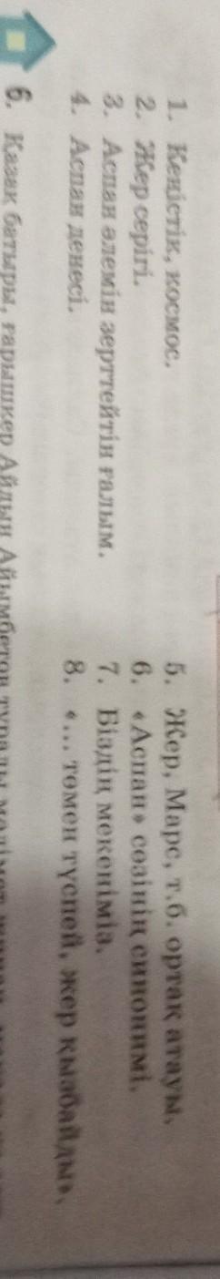 1. Кеңістік, космос. 2. Жер серігі. 3. Аспан әлемін зерттейтін ғалым. 4. Аспан денесі. 5. Жер, Марс, т.б. ортақ атауы. 6. «Аспан» сөзінің синоні. 7. Біздің мекеніміз. 8. «... төмен түспей, жер кызбайты отинеммм 25 балл берем