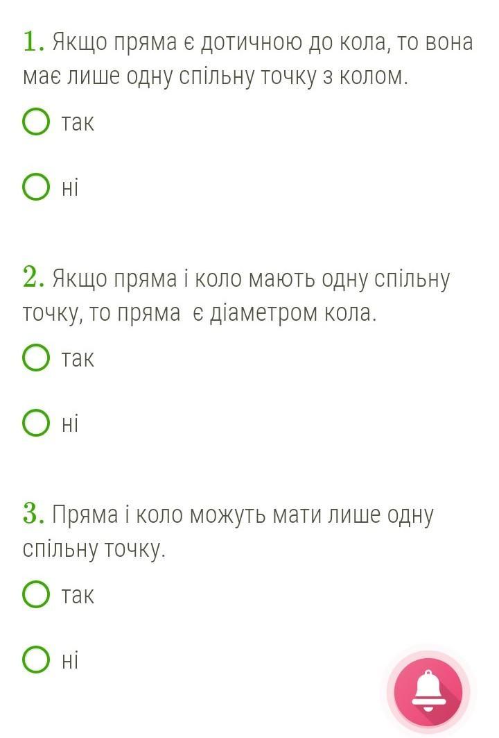2.Ні (Якщо пряма і коло мають одну спільну точку, то пряма є дотичною до кола)