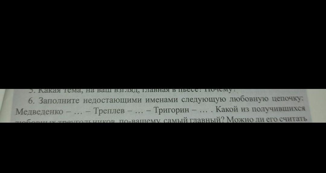 Медведенко - Мария (Маша) Шамраева - Треплев - Нина Михайловна Заречная - Тригорин - Ирина Николаевна Аркадина.