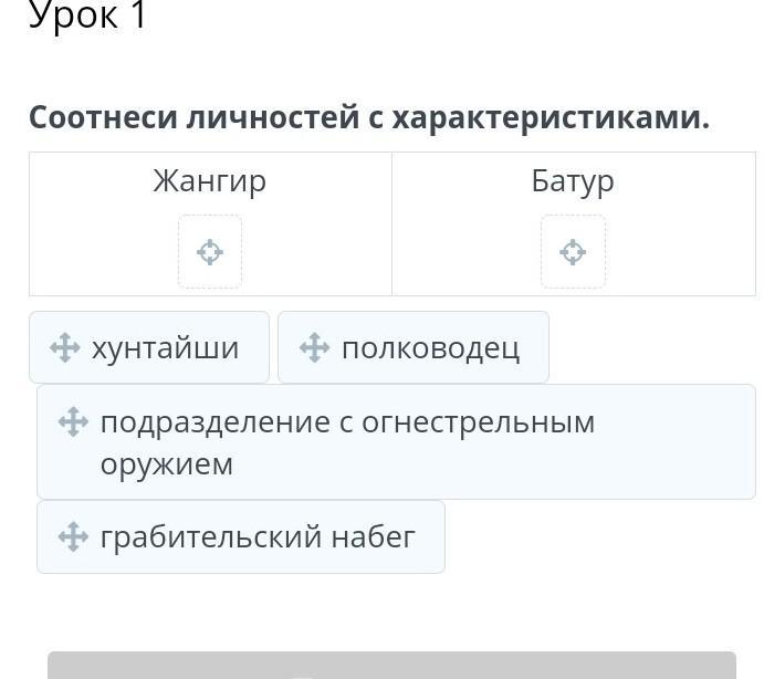 Казахско-джунгарское противостояние при Жангир-хане. Урок 1 Соотнеси личностей с характеристиками. Жангир Батур хунтайши полководец подразделение с огнестрельным оружием грабительский набег Назад Проверить.Зажание маленькое жду скорого ответа.