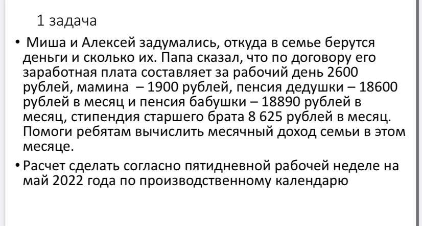 В мае 2022 года 20 рабочих дней.Посчитаем зарплату мамы (1900 х 20 = 38000).Папина зарплата - 2600 х 20 =52000. Дальше сложим все числа (за месяц).38000 + 52000 + 18600 +18890 +8625 = 162115.