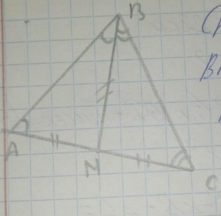 если медиана ВМ=МС=МА, то М- центр описанной около трегуольника АВС окружности, АС- ее диаметр, а угол АВС , опирающийся на диаметр окружности, прямой