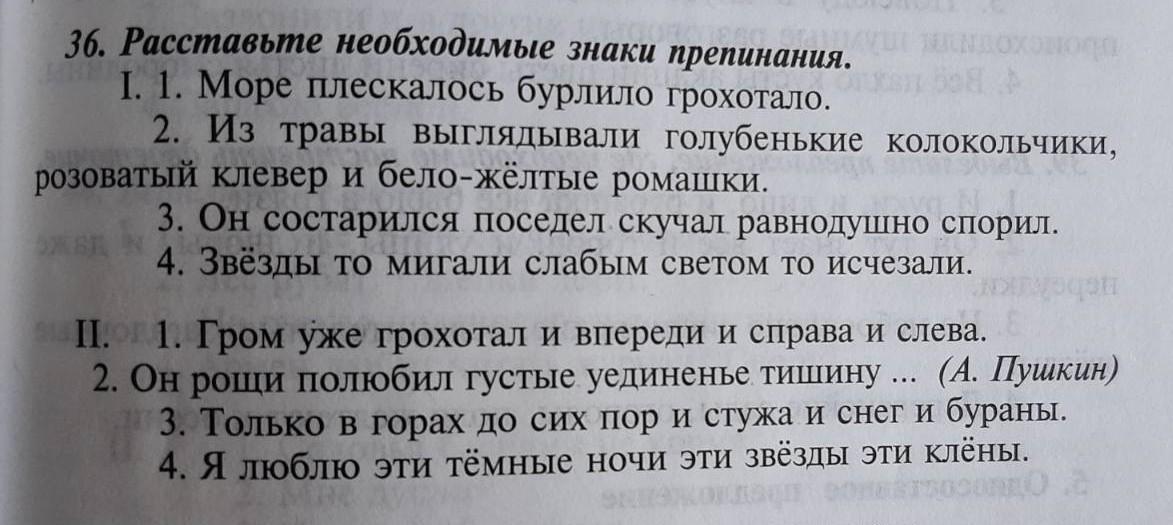 36. Расставьте необходимые знаки препинания. I. 1. Море плескалось бурлило грохотало. 2. Из травы выглядывали голубенькие колокольчики, розоватый клевер и бело-жёлтые ромашки. 3. Он состарился поседел скучал равнодушно спорил. 25 4. Звёзды то мигали слабым светом то исчезали. сан II. 1. Гром уже грохотал и впереди и справа и слева. 2. Он рощи полюбил густые уединенье тишину ... (А. Пушкин) 3. Только в горах до сих пор и стужа и снег и бураны. 4. Я люблю эти тёмные ночи эти звёзды эти клёны.