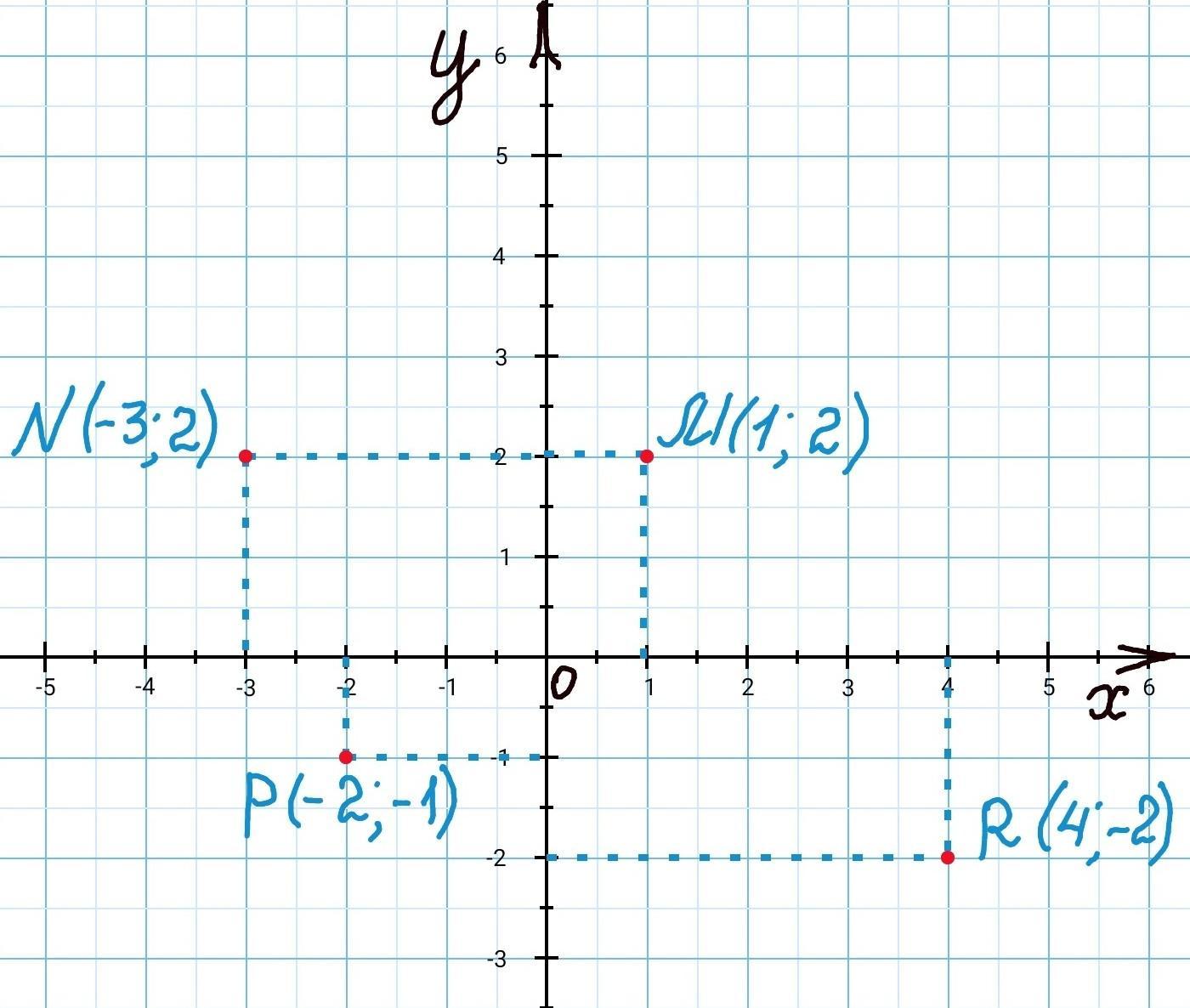 Изобразите координатную плоскость и отметьте на ней точки M (1; 2), N (–3; 2), P (–2; –1), R (4; –2) (12 баллов).