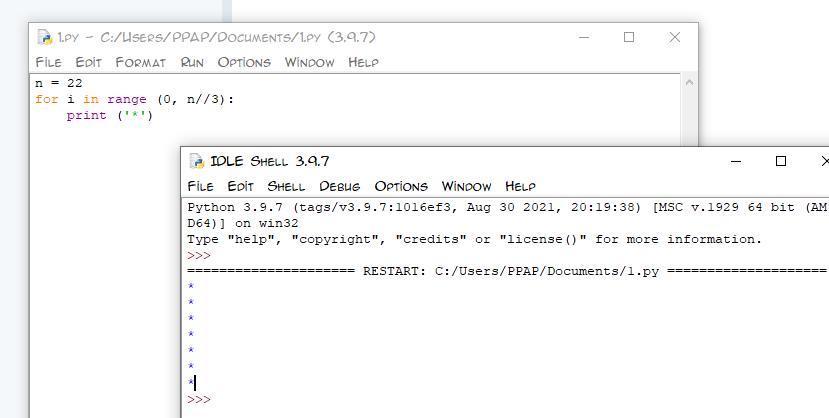 Сколько звёздочек напечатает эта программа? Python n = 22 for i in range (0, n // 3): print('*') В ответ запишите одно число.