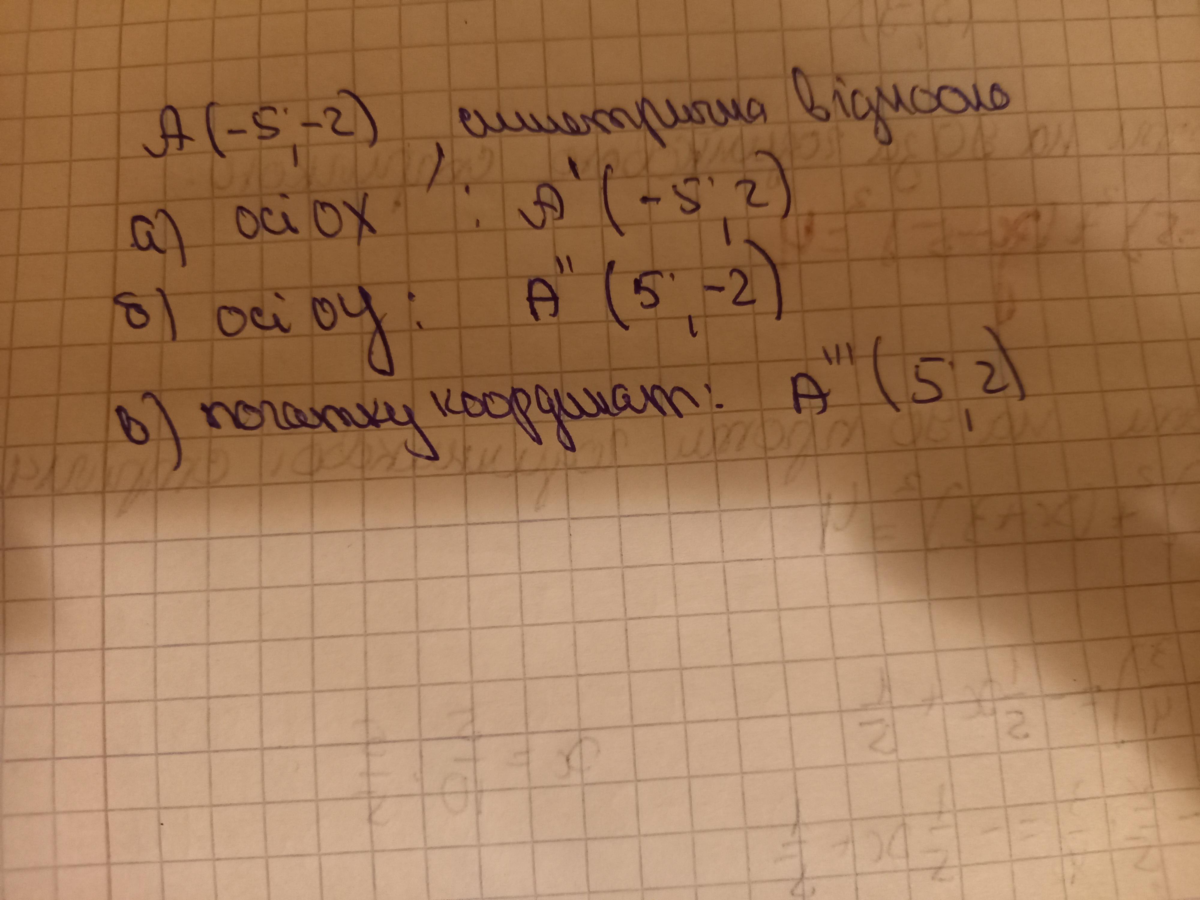Які координати має точка симетрична точці А(-5;-2) відносно а) осі ОХ;. б) осі ОУ. ; в) початку координат