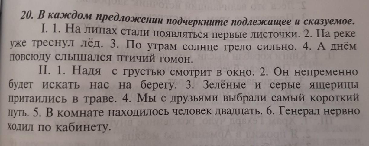 20. В каждом предложении подчеркните подлежащее и сказуемое. I. 1. На липах стали появляться первые листочки. 2. На реке уже треснул лёд. 3. По утрам солнце грело сильно. 4. А днём повсюду слышался птичий гомон. I. 1. Надя с грустью смотрит в окно. 2. Он непременно будет искать нас на берегу. 3. Зелёные и серые ящерицы притаились в траве. 4. Мы с друзьями выбрали самый короткий путь. 5. В комнате находилось человек двадцать. 6. Генерал нервно дав Ходил по кабинету.