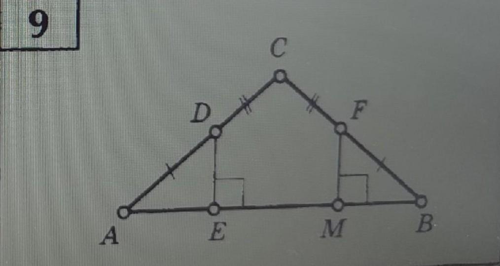 Рассмотрим треугольник ADE: в нём сторона DE равна на стороне FM, так как как треугольник ACB равнобедренный (по условию); сторона AD равна стороне FB (также по условию). Если 2 стороны одного треугольника соответственно равны двум сторонам другого треугольника, то такие треугольники равны и ,следовательно, сторона AE равна стороне MB, то есть треугольник ADE равен треугольнику BFM, но так как они прямоугольные (угол Е = 90), то угол А = углу Д = (180-90):2 = 45.