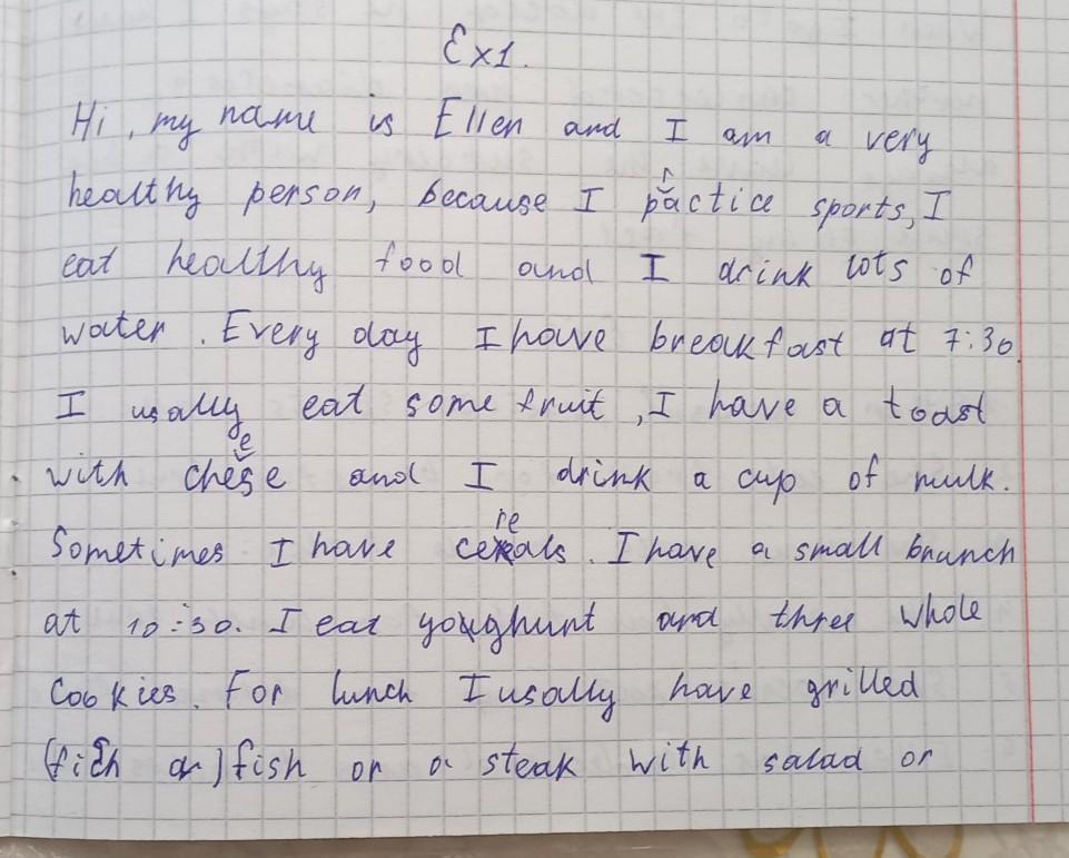 Привіт, я Еллі і я дуже здорова людина, тому що я займаюся спортом, їм здорову їжу та п'ю багато води. Кожного дня у мене сніданок о 7.30. Зазвичай я їм фрукти та п'ю стаканчик молока. Іноді я споживаю крупи. Я маю невеличкий перекус о 10.30. Я п'ю йогурт і три цілих печива. На вечерю я зазвичай їм рибу на грилі або стейк із салатом