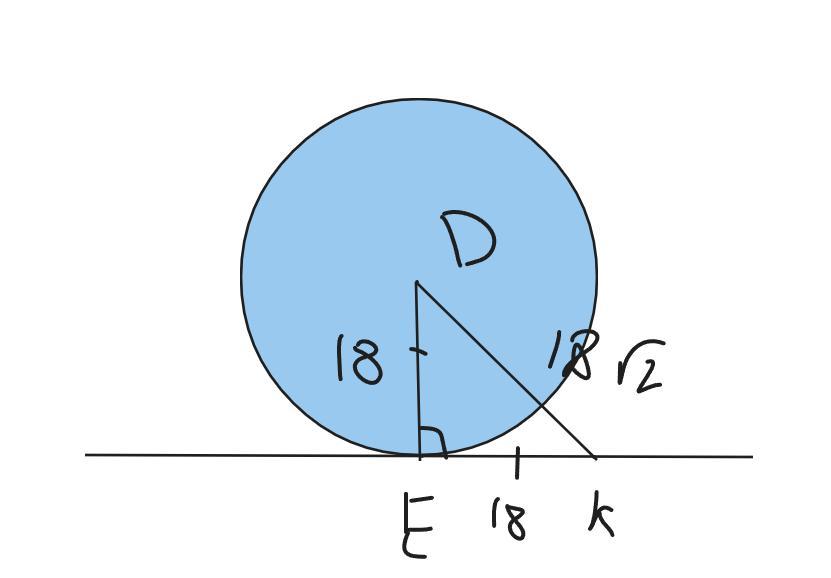 Проведем радиус ЕD в точку касания Е, тогда ED⊥EK⇒ΔEDK-прямоугольный. Так же данный треугольник равнобедренный ,по условию, ED=EK=18 см