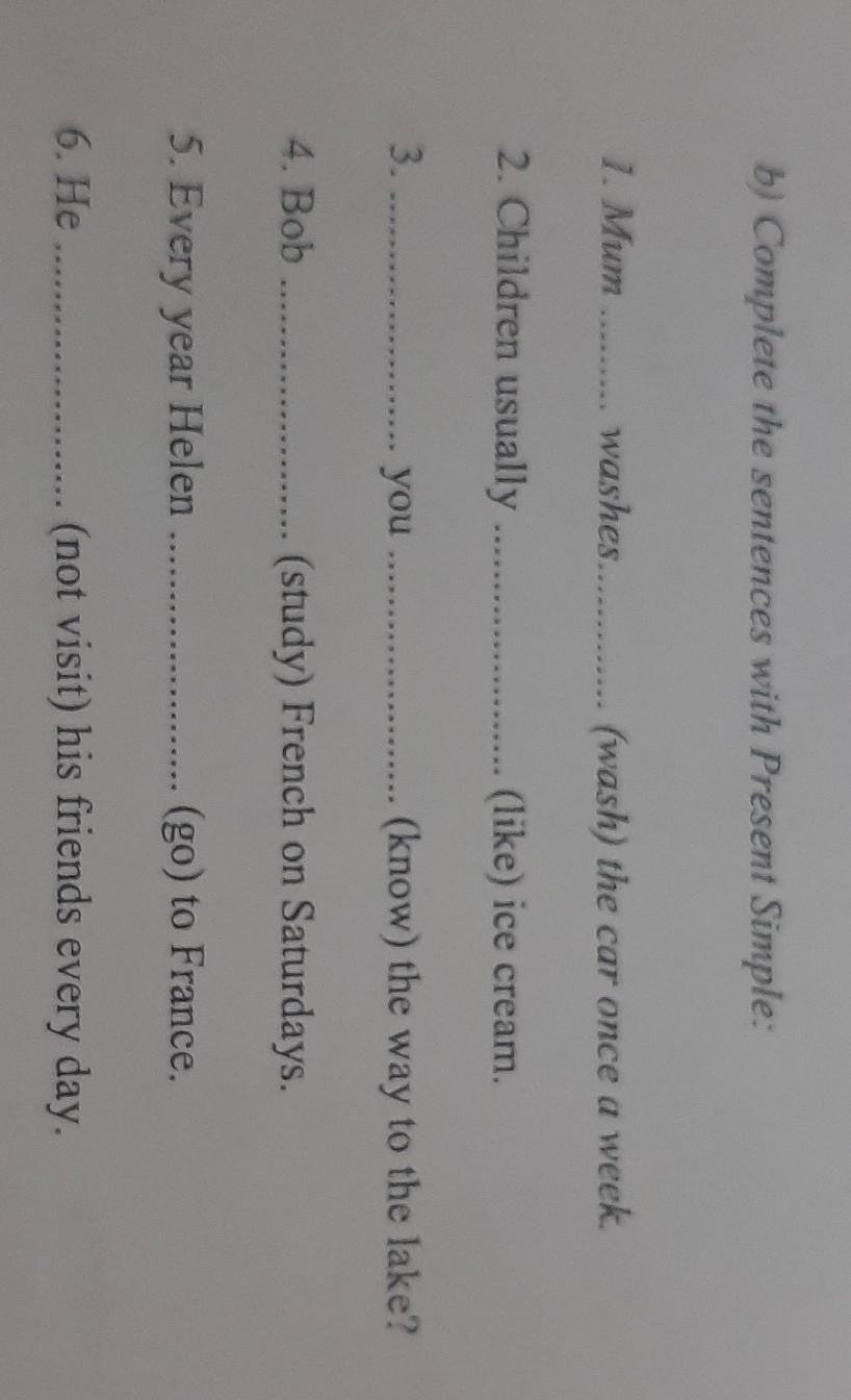 b) Complete the sentences with Present Simple: 1. Mum ... washes (wash) the car once a week 2. Children usually (like) ice cream 3....... .. you (know) the way to the lake? 4. Bob ... (study) French on Saturdays. 5. Every year Helen (go) to France. 6. He (not visit) his friends every day.
