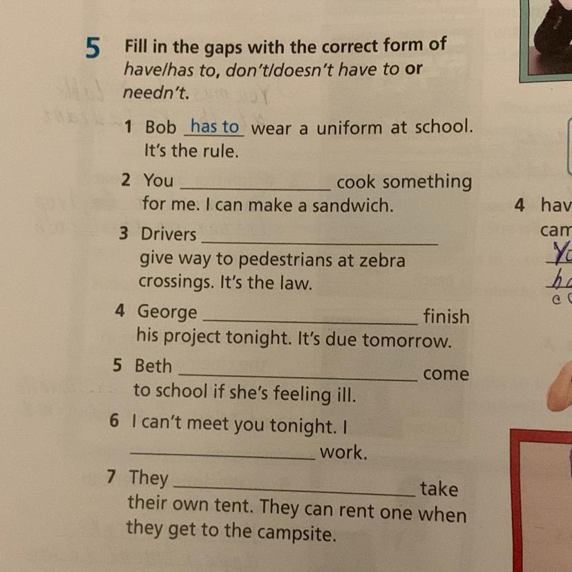 needn;t have to; doesn't have to; doesn't have; have to; needn't