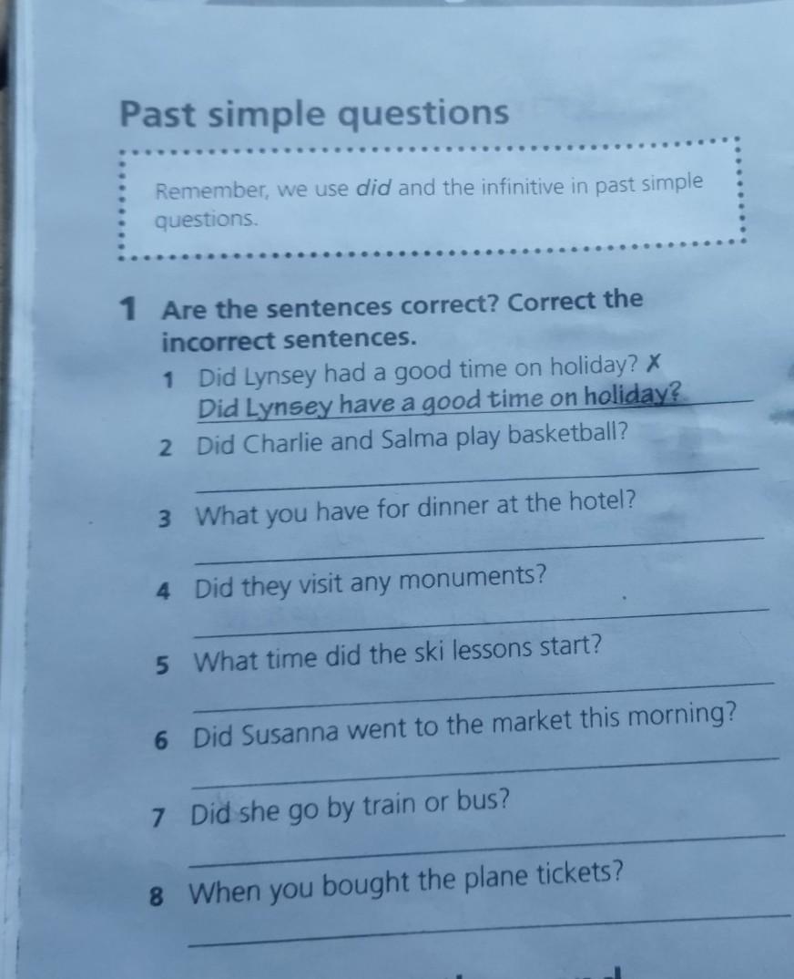 Past simple questions Remember, we use did and the infinitive in past simple questions 1 Are the sentences correct? Correct the incorrect sentences. 1 Did Lynsey had a good time on holiday? X Did Lynsey have a good time on holiday? 2 Did Charlie and Salma play basketball? 3 What you have for dinner at the hotel? 4 Did they visit any monuments? 5 What time did the ski lessons start? 6 Did Susanna went to the market this morning? - Did she go by train or bus? When you bought the plane tickets? simple questions and пожалуйста срочно