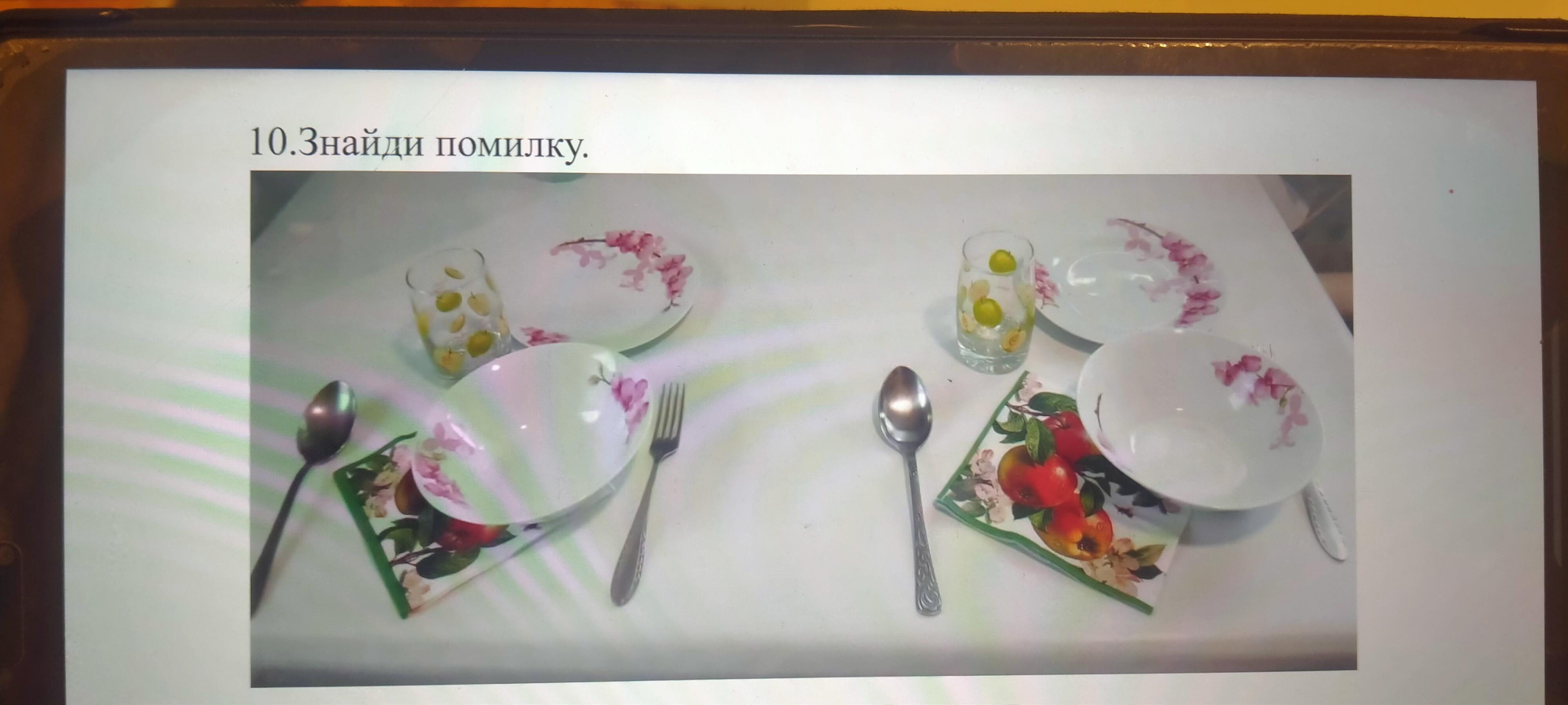 Объяснение:Вилка должна лежать с левой стороны возле салфетки,а ложка на правой.А стакан возле ложки