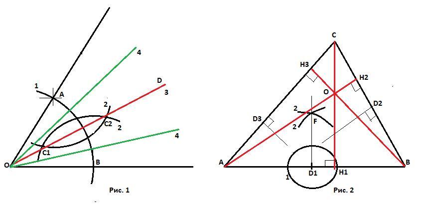 Получаем две точки C1 и C2. Из вершины угла О рисуем линию OD, проходящую через C1 и C2. Я нарисовал её красным.
