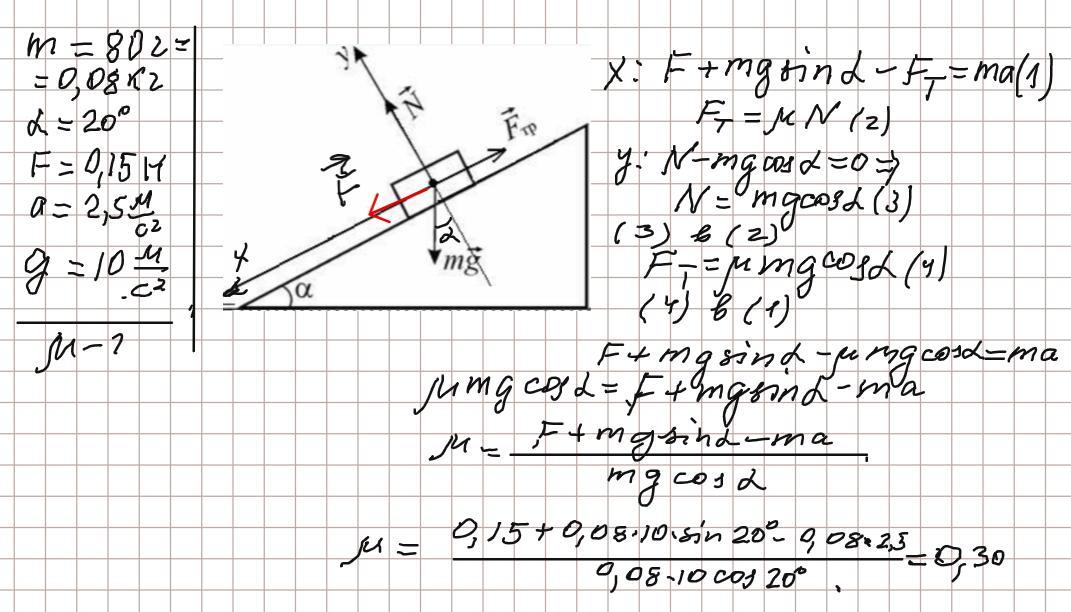 Брусок, маса якого 80 г, стягують з похилої площини з кутом 20°, прикладаючи до бруска силу 0,15 Н уздовж площини. Брусок рухається з прискоренням 2,5 м/с². Визначте коефіцієнт тертя між бруском і площиною.